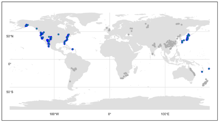Physg3arAZ is one of the earliest CLAMP calibrations and comprises physiognomic data from 173 mostly in North America, Japan, the Caribbean and Pacifica. You can inspect the files by downloading them, but you do not need to do this if you just want to do an online analysis because they are built into the analytical system. A Google Earth .kmz file showing the locations can also be downloaded. Some of the vegetation sites recorded in this calibration have since been destroyed so you may need to use the historical functions in Google Earth to see what was sampled.