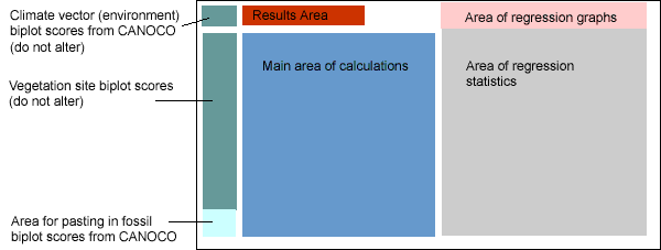 Normally the only areas of direct interest are those coloured light blue and red. The light blue area is where you paste in you fossil site biplot scores from the CANOCO solution file. As you do this the spreadsheets automatically calculate the position of your fossil sites in physiognomic space and calculate the climate predictions. These are displayed in the area coloured red, together with the standard deviation of the residuals about the regression lines (pink area) as a measure of the statistical uncertainty associated with the results. These regression statistics alter with changes to the modern data sets or a different combination of climate parameters. It is not recommended that you alter either. If you do so you will generate erroneous results unless you reconfigure the entire sreadsheets with new regression equations. Download the 144 site results Excel 5.0/95 spreadsheet Res3brAZ.xls(1.1Mb) |