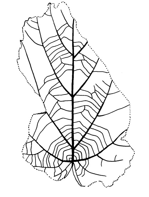 Leaf: simple; symmetrical; shape ovate; apex missing; base cordate; margin crenate except at base where entire, teeth small (< 1.0 mm) irregular in size, apex rounded, sinus rounded; venation basal imperfect marginal actinodromous; primary midvein moderate, more or less straight; a-pectinals depart midvein suprabasally at an angle of 35-45°, may be initially recurved, uniformly curved; a-abmedials given off at an angle of approximately 45°, and curved, tending to be looped; b-pectinals arise at an angle of 90-105°, moderate, more or less uniformly curved with some abrupt changes of curvature at the departure points of the abmedial veins; b-abmedials given off on abmedial (basal) side at an angle of 70-90°, curved and forked and forming arches by joining the superadjacent b-abmedial or branch thereof at an obtuse angle; superior secondaries arising from the midvein at angles of approximately 45°, opposite or nearly so, curved but course somewhat irregular, may give off craspedodromous branches abmedially at 45°; tertiary veins percurrent, transverse, predominantly convex, joining both ad- and abmedial sides of secondaries at acute angles of 90°, concentric to the petiole junction with the lamina, may be forked; fourth order veins forming an orthogonal reticulum.