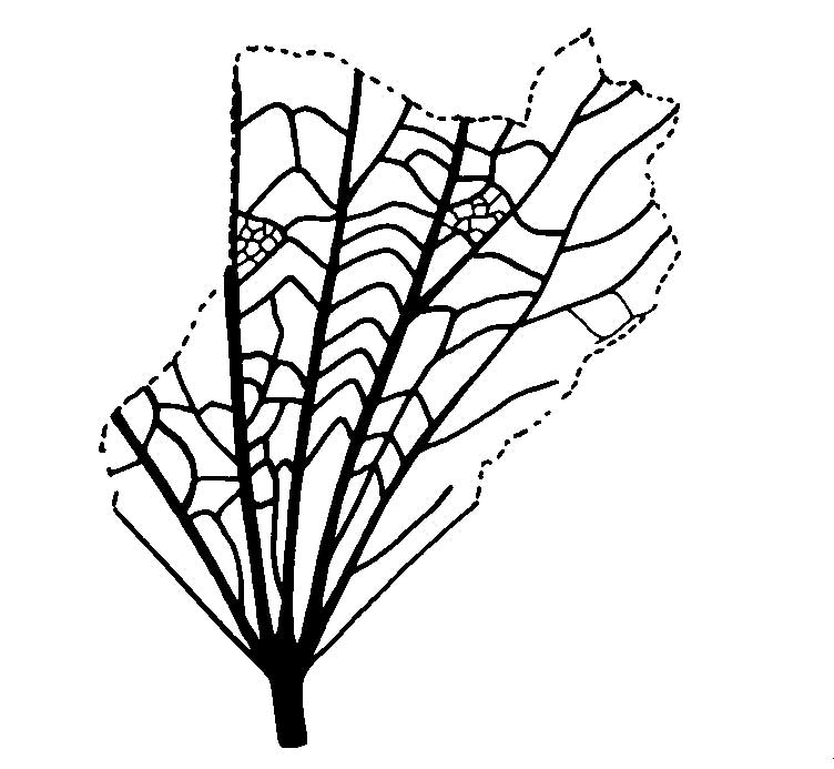 Leaf: simple; symmetrical; wide to very wide obovate; apex missing; base cuneate; margin crenate; teeth irregular in size and spacing, rounded apparently nonglandular apices and acute sinuses, margin entire near the base; venation basal acrodromous; primary midvein moderate straight or nearly so, pectinal veins arising at an angle of 20-30°, moderate, curved uniformly towards the apex or with sudden changes of curvature at the point of departure of the pectinal abmedial veins; abmedials arising at an angle of 45-50°, stout, sinuous or curved in an apical direction, looping irregularly near the margin to join superadjacent abmedial or higher order loops at an acute angle, abmedial veins often branched, basal abmedials branched abmedially therefore weak b-pectinals; b-pectinals departing at junction of a-pectinals on midvein; b-abmedials looped as in a-abmedials; superior secondary veins departing midvein at 40-45°, looped about midvein; tertiary veins stout, often percurrent, convex in the axils of vein branches becoming more or less straight, percurrent, simple or branched, between the a-pectinals and midvein, tertiaries frequently angularly convex, often branched, forming a very acute angle with the a-pectinals and midvein; third order looping present near the margin; fourth order veins stout, random reticulate; the tooth venation consisting of a second or third order medial vein with two lateral bracing third order veins that run close to and parallel to the tooth margin, the medial vein giving off fourth order lateral veins at approximately right angles.