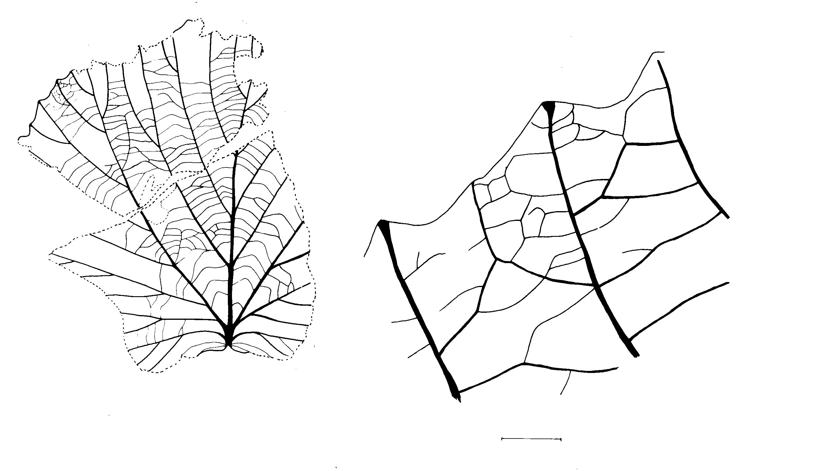 Leaf: simple; asymmetrical (?); wide obovate (?); apex missing but probably obtuse or rounded; base auriculate; margin dentate except at the base where entire, teeth with obtuse angular apices with a swollen gland or lacuna terminating the tooth median vein, wide shallow rounded sinuses, teeth irregular in size and spacing; venation suprabasal perfect marginal actinodromous; primary midvein moderate more or less straight but curving to one side near the apex, pectinal veins arising from the midvein at an angle of 35-45° and uniformly shallowly curved; superior secondary veins arising from the midvein at angles of 35-45° and uniformly shallowly curved, often branching at two-thirds or more of the distance to the margin, abmedial veins numerous, uniformly shallowly curved and arising at an angle of approximately 45°, often branching, terminating in apices of teeth branches; some also given off at 45° on the admedial side of the pectinals near the margin; a single pair of strong inferior secondary veins arises from the midvein directly below the point of departure of the pectinals and recurves before branching abmedially, basal to these are a double pair of weaker inferior secondary veins recurving into the basal lobes; tertiary veins between the secondaries moderate, percurrent, convex or nearly straight, arising with acute to right angles on both ad- and abmedial sides of the secondaries, sometimes branched; fourth order veins orthogonal.