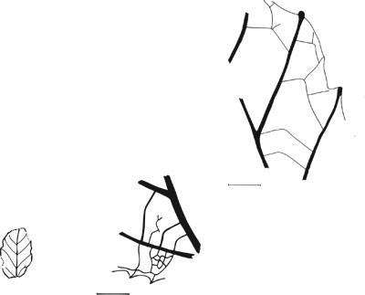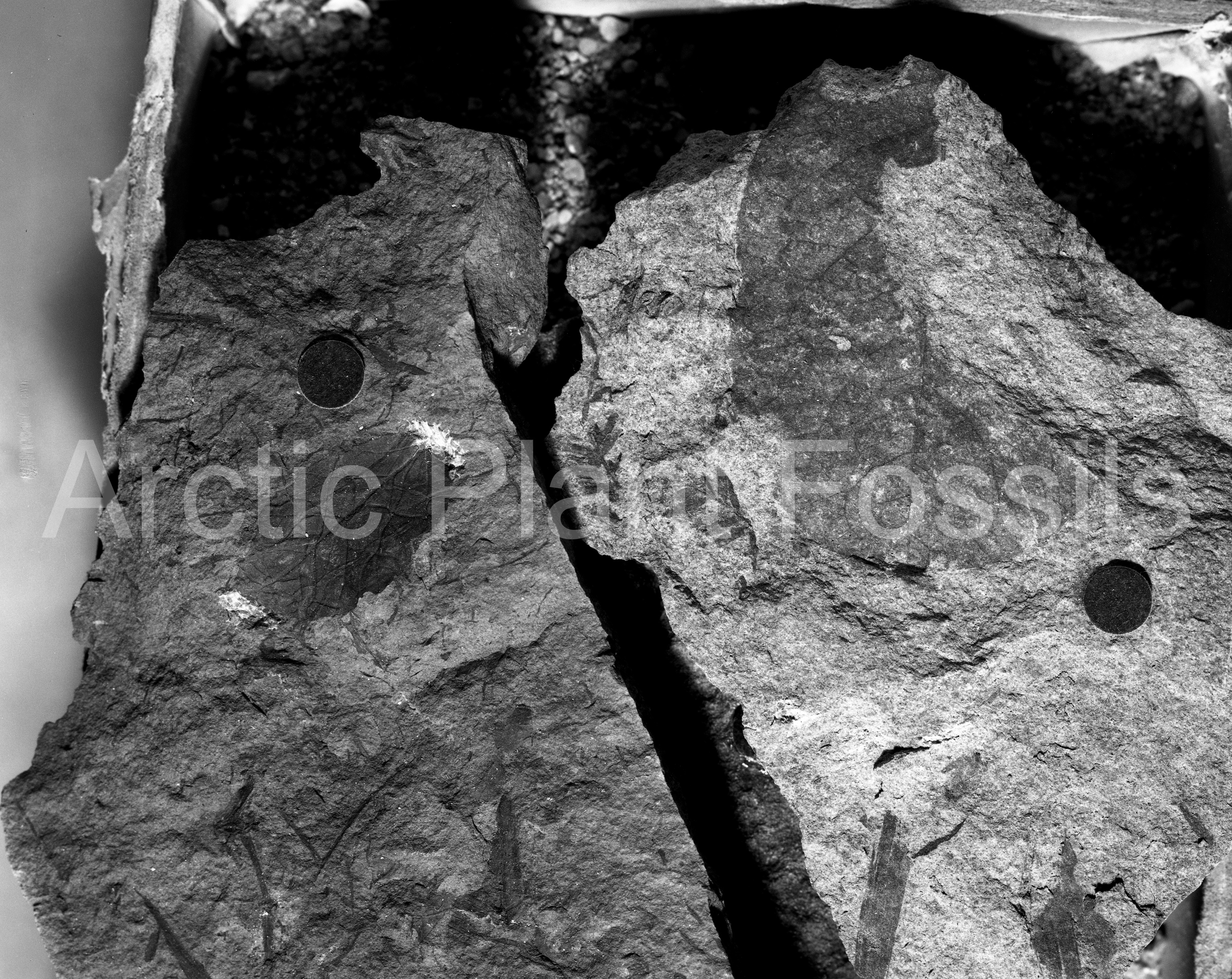 This is one of two leaves that apparently represent the same form. Specimen USGS 11500.1 is better preserved than USGS 11598.3 (USNM 406832) and details of the venation are shown here. The pinnate semicraspedodromous secondary venation, the transverse tertiaries and the possibly Rosiod tooth type all suggest an architectural relationship to members of the Rosidae.