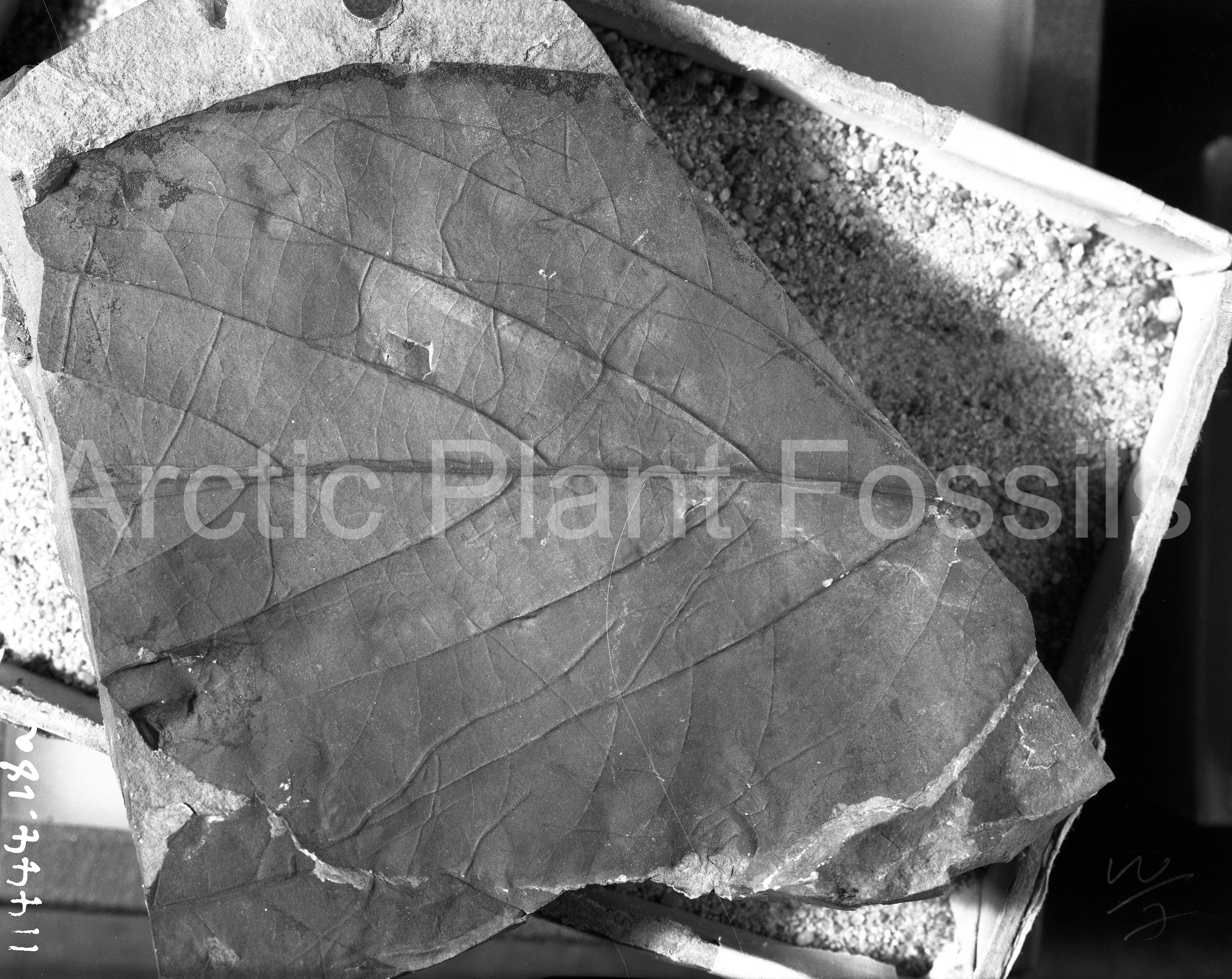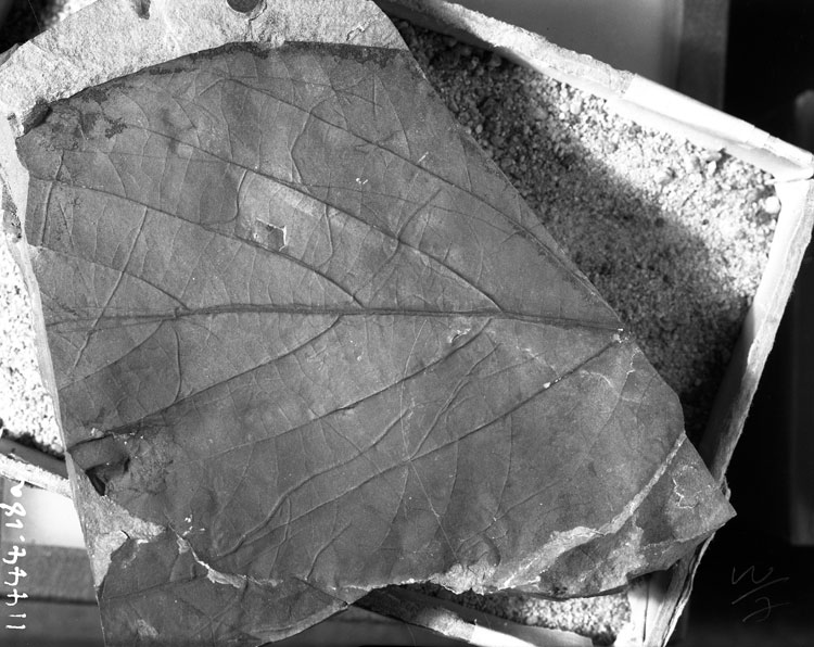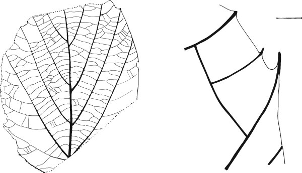 This specimen is regarded as belonging to the same species as specimen USGS 11600.4. and is particularly interesting in that it apparently has revolute margins and at first sight does not seem to possess teeth. The teeth are only revealed after careful removal of the matrix. The venation of this specimen is almost identical to that of 'Ficus' planicostata var. magnifolia Knowlton (1922; Plate 10, Fig. 3), the only difference being the basal origin of the two strong secondaries. Knowlton's leaf has the same texture and apparently revolute margins. Unfortunately Knowlton's specimen has not been examined directly and strict comparisons cannot be made. The weak pectinal veins do not always arise from the same point opposite one another on the midvein (as cam be seen here on specimen USGS 11600.4) and are considerably weaker than the midvein at their point of departure.