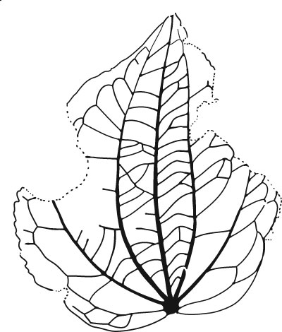 Leaf: simple; symmetrical; shape ovate; apex obtuse to acuminate; base shallowly lobate to rounded sometimes with a decurrent junction to the petiole; petiole stout and long; margin crenate except at the base where it is entire, the axes of the teeth pointing towards the apex, sinuses rounded, spacing irregular; venation basal perfect acrodromous, primary midvein moderate more or less straight; pectinals moderate, inwardly curving towards the apex but somewhat angular at the junction of the pectinal abmedials; pectinal abmedials arising at an acute (wide to moderate) angle, curved, brochidodromous, joining the superadjacent abmedial approximately at right angles, the basal abmedials arising so close to the junction of the midvein and pectinals that the base of the leaf has a campylodromous appearance; tertiary veins between the primary, secondary, and pectinal veins are convex, percurrent and occasionally branched once or twice; third order veins looping abmedially from the pectinal abmedials to form festooned loops of at least two ranks with a tendency towards the formation of an intramarginal vein near the base; fourth order veins running percurrently between the secondary and tertiary veins and either straight or forked.
