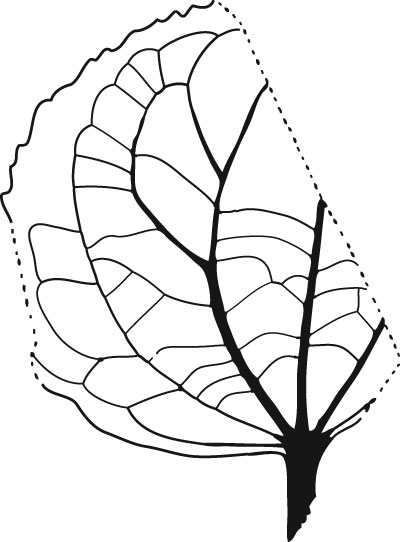 Leaf: simple; symmetrical; shape ovate; apex obtuse to acuminate; base shallowly lobate to rounded sometimes with a decurrent junction to the petiole; petiole stout and long; margin crenate except at the base where it is entire, the axes of the teeth pointing towards the apex, sinuses rounded, spacing irregular; venation basal perfect acrodromous, primary midvein moderate more or less straight; pectinals moderate, inwardly curving towards the apex but somewhat angular at the junction of the pectinal abmedials; pectinal abmedials arising at an acute (wide to moderate) angle, curved, brochidodromous, joining the superadjacent abmedial approximately at right angles, the basal abmedials arising so close to the junction of the midvein and pectinals that the base of the leaf has a campylodromous appearance; tertiary veins between the primary, secondary, and pectinal veins are convex, percurrent and occasionally branched once or twice; third order veins looping abmedially from the pectinal abmedials to form festooned loops of at least two ranks with a tendency towards the formation of an intramarginal vein near the base; fourth order veins running percurrently between the secondary and tertiary veins and either straight or forked.