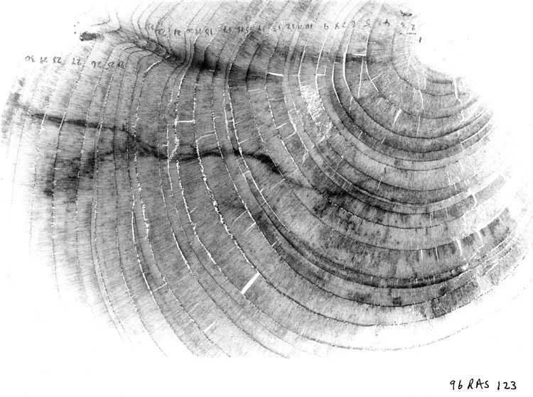 Transverse section of wood that lacks vessels. Sample taken from a fallen log.