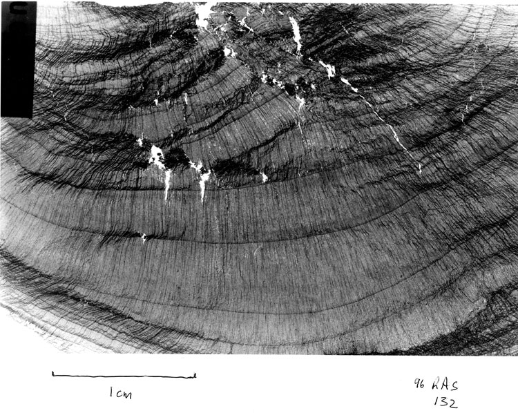 Transverse section of wood that lacks vessels. Sample taken from a fallen log.