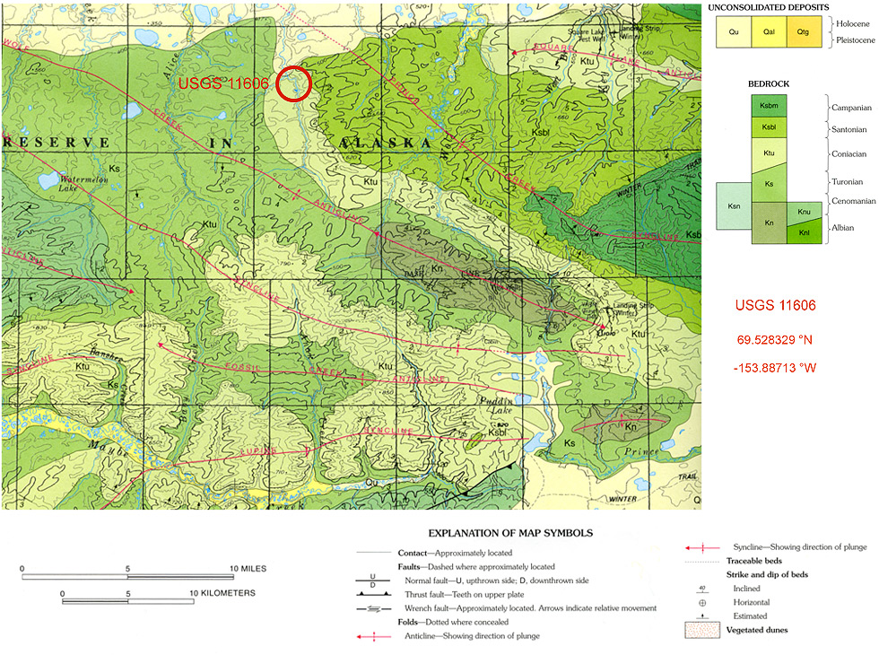 These localities belong to the Tuluvak Tongue of the Prince Creek Formation and are of Coniacian age. The fossil specimens at locality USGS 11606 are from siderite nodules within bentonitic clays underlying a prominent coals seam shown in the image on the right. A simplified graphic log of the USGS11606 locality is shown on the left. A geological map showing the position of the USGS11606 locality may be accessed here. These localities provide the Type Taphoflora for the Tuluvak Floral Phase.