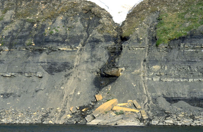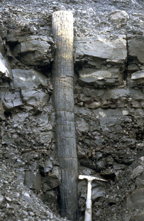 | Detail of the upright tree stump arrowed above. | The cliff section showing the tree stump in context. |