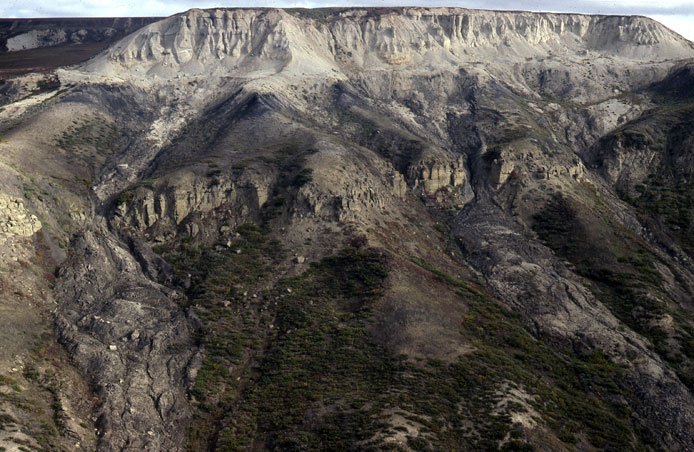 Photograph, looking northwest, of the bluffs at the northern end of the sagwon section showing the light gray conglomerates of the Sagwon member of the Sagavanirktok Formation unconformably overlying Coal IV that here forms the uppermost unit of the Prince Creek Formation.