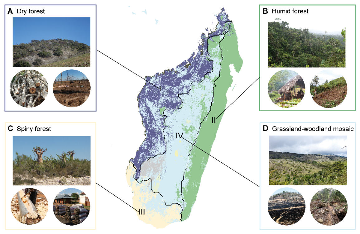 马达加斯加植被分区(A.干旱森林;B.湿润森林;C.多刺森林、D.草原-林地交错区)和导致生物多样性丧失的主要人为因素