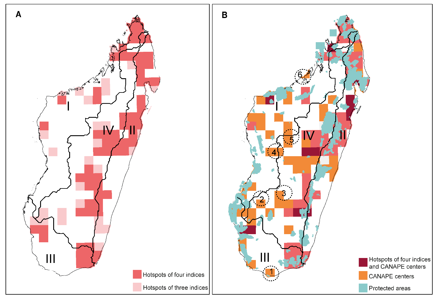 最后,研究人员将多样性热点、特有中心与现有保护地进行叠加分析,在马达加斯加西部和南部发现6个长期被忽视的保护空缺区域。本研究认为马达加斯加西部和南部干旱、半干旱地区在孕育和维持新特有类群方面具有重要作用,为更新马达加斯加生物多样性保护方案提供了新视角。