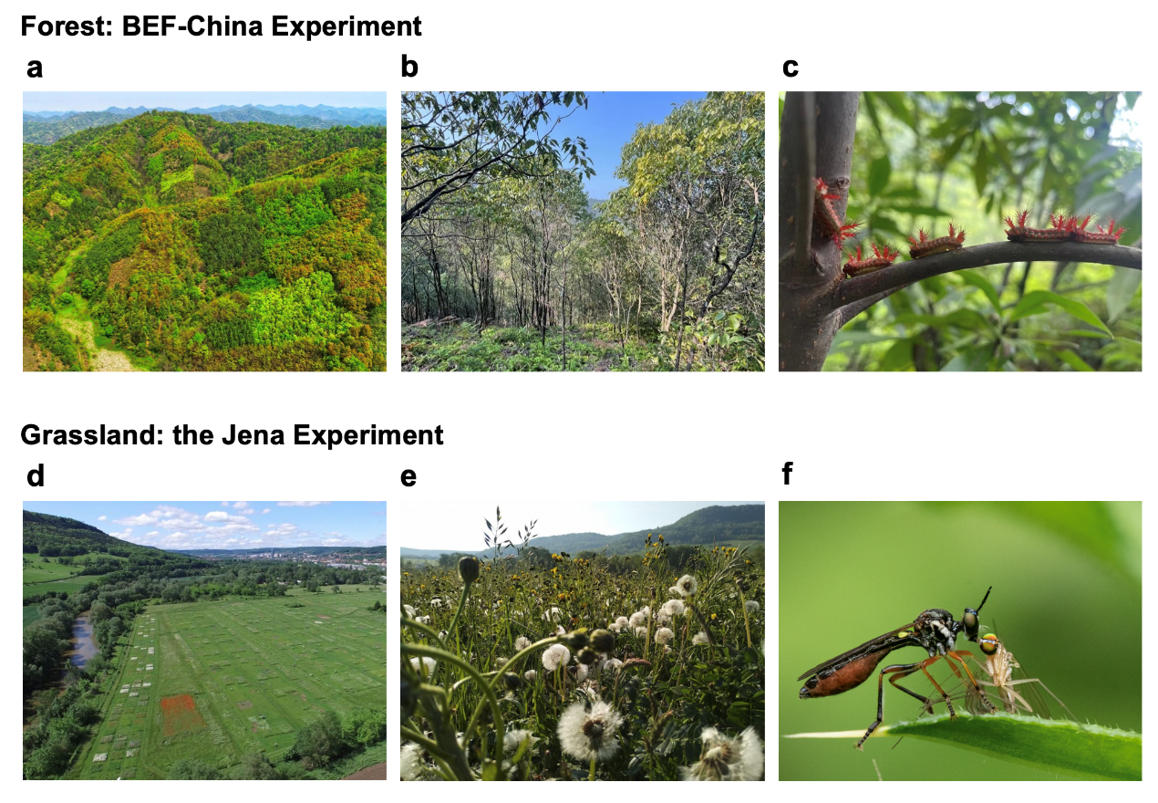 研究人员通过整合来自我国亚热带地区的大型森林生物多样性实验(BEF-China)和德国温带地区的大型草地生物多样性实验(Jena)多年累积的多营养级和生态系统功能数据,揭示了无论在森林还是草地生态系统中,植物多样性通过提高其它营养水平的多样性促进了生态系统多功能性的重要机制,为深入理解生物多样性丧失影响生态系统功能的过程和机理提供了新视角。