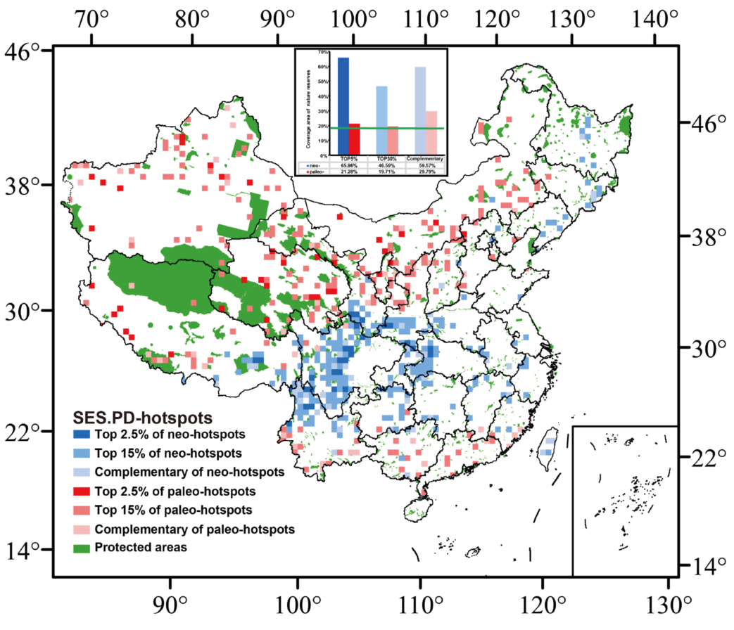 将热点区域与中国现有自然保护地体系叠加分析后,研究发现古生物多样性热点的保护覆盖率较低,揭示其在未来保护地规划与管理中应被优先关注。该成果为优化中国裸子植物保护策略,完善自然保护地体系以及支持国家生物多样性保护目标的实施提供了重要科学依据。