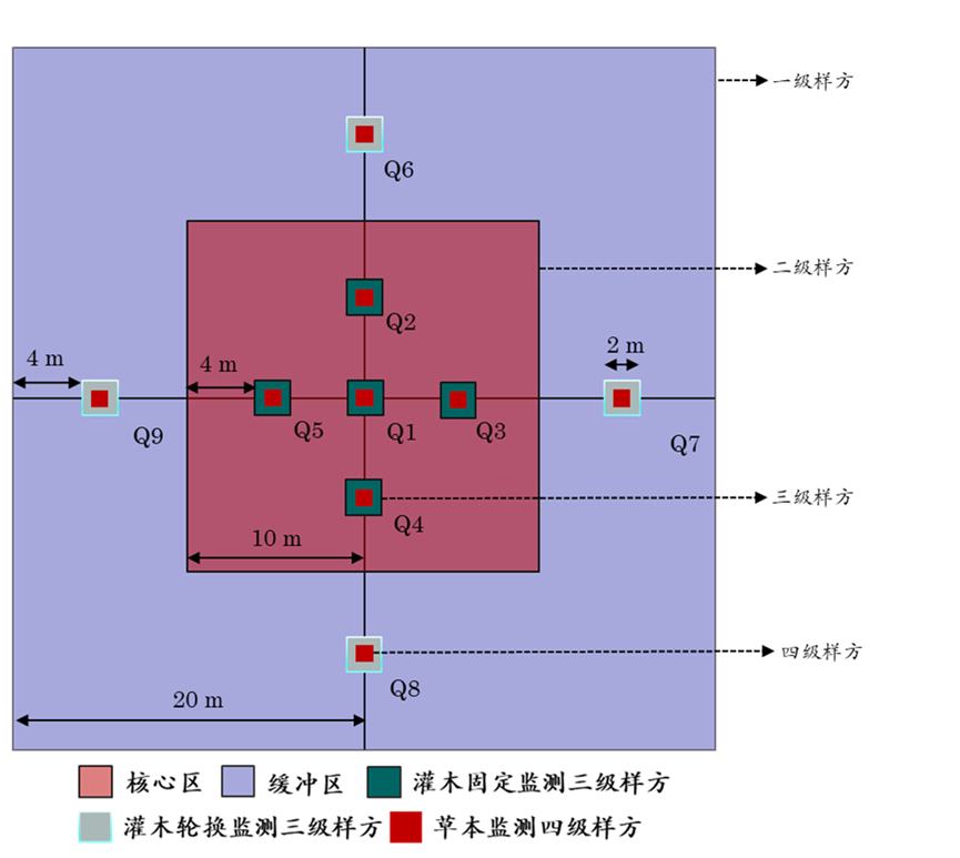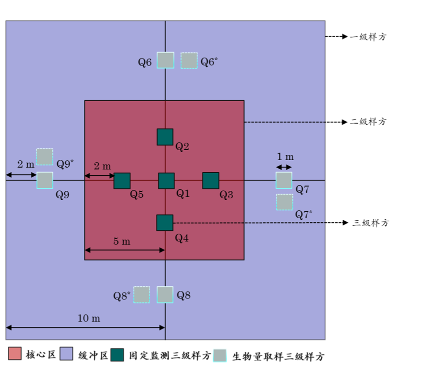 位于核心区的调查样方(Q1~Q5)用于非破坏性调查,主要用来进行物种组成、群落高度、盖度等指标的调查,为了能更准确地进行前后数据的对比,应确保每次调查的位置长期不变。位于缓冲区的调查样方(Q6~Q9)除了用于非破坏性调查外,还可以进行破坏性采样,如草本植物地上生物量监测。进行草本植物地上生物量取样的样方,取样后的植物生长必然会受到影响,所以,每次调查都需要进行轮换。这些用于地上生物量调查的样方可按照顺时针方向轮替,每次可间隔1 m距离设置,以保证10年内每次用于草本植物地上生物量调查的样方在空间上不重叠。