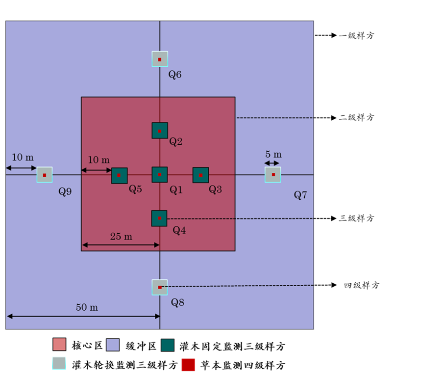 乔木群落样方格局是在灌木群落样方格局(图3)基础上进行布设,具体如下:一级样方为最外围的样方,二级样方位于一级样方内,二级样方的中心点和一级样方中心点重合,方向一致;二级样方内部区域为核心区,一级样方边界与二级样方边界之间的区域为缓冲区,缓冲区宽25 m。核心区4均分,设置为开展乔木调查的样方,即在二级样方内开展乔木调查;其他灌木层和草本层的调查同2.3 草本植物群落和2.4 灌木群落,在核心区设置三级样方5个,即图3中的Q1-Q5样方,用于灌木监测,缓冲区设置三级样方4个,即图3中的Q6~Q9样方,用于灌木层调查;在每个三级样方的中心设置1个四级样方,用于草本层调查,其中,在Q1-Q5样方中设置的四级样方用于非破坏性调查,在Q6~Q9样方中设置的四级样方可用于开展破坏性调查。各级样方在样地中的具体位置见图3。